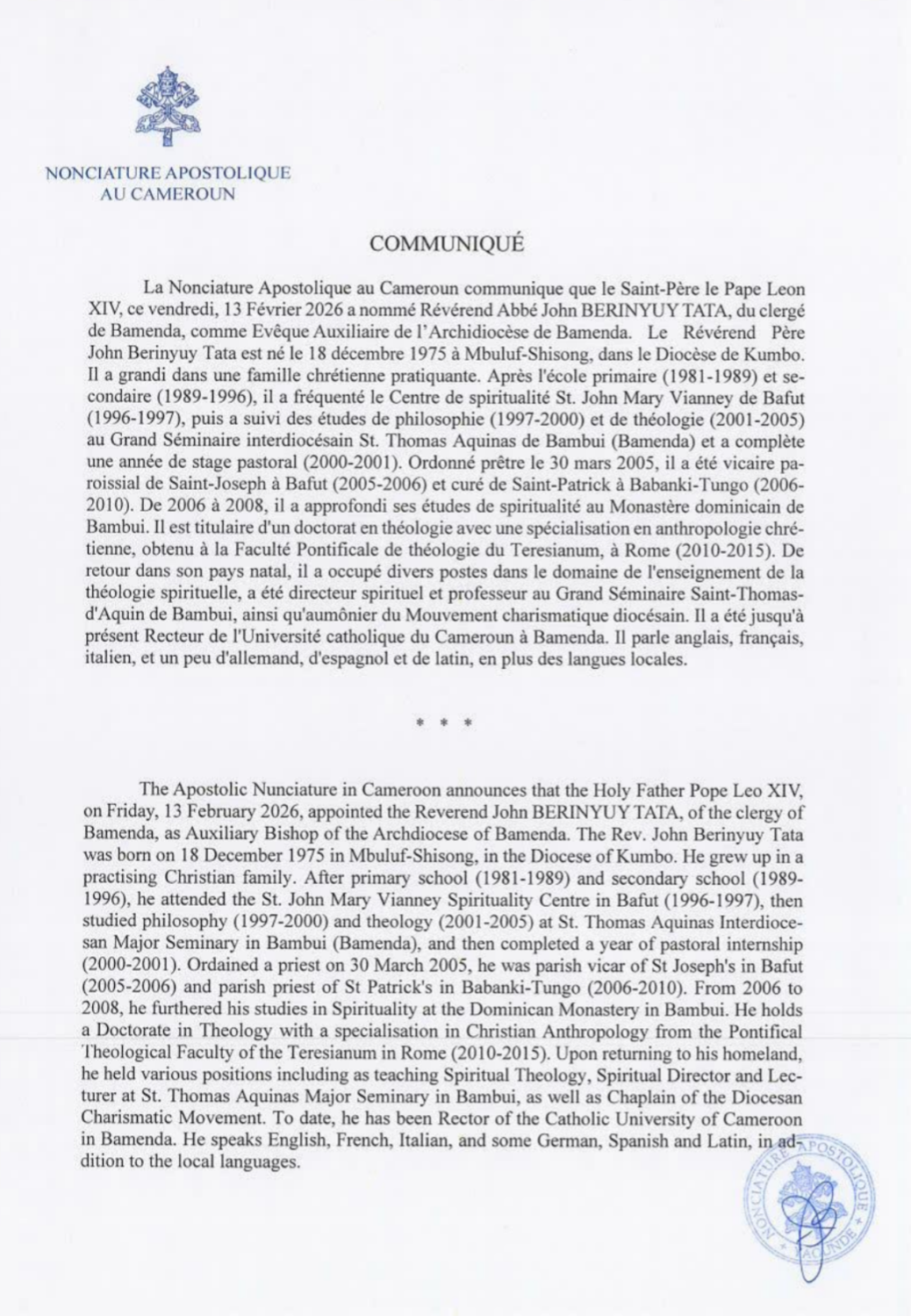 The Holy Father, Pope Leo XIV, has appointed the Rev. John BERINYUY TATA as Auxiliary Bishop of the Archdiocese of Bamenda, Cameroon.