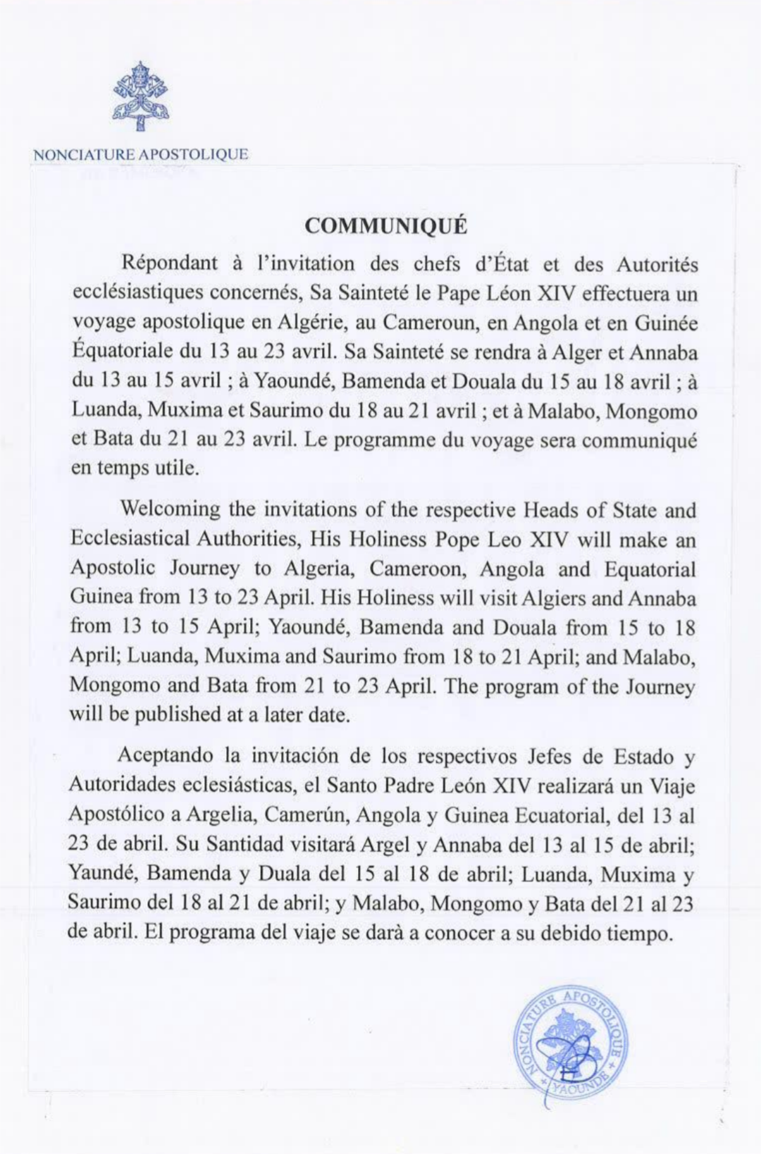 The Apostolic Nunciature has officially announced that, responding to invitations from Heads of State and local Ecclesiastical Authorities, His Holiness Pope Leo XIV will undertake a significant Apostolic Journey to Africa this April.
